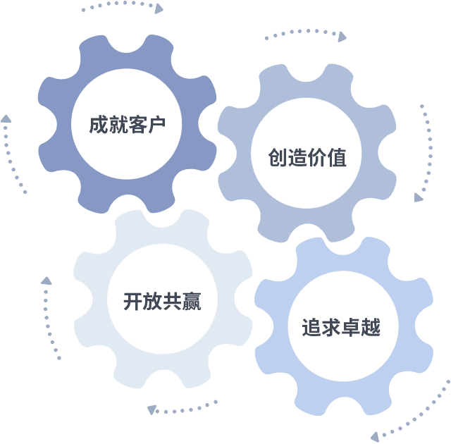 成就客户是一切决策的出发点,,创造价值是衡量所有工作的标准,,,,追求卓越是我们做事做人的态度,,,开放共赢是我们的格局也是最终的结果。。。价值观的齿轮环环相扣,,,推动着组织里的每个人不断向前。。。。